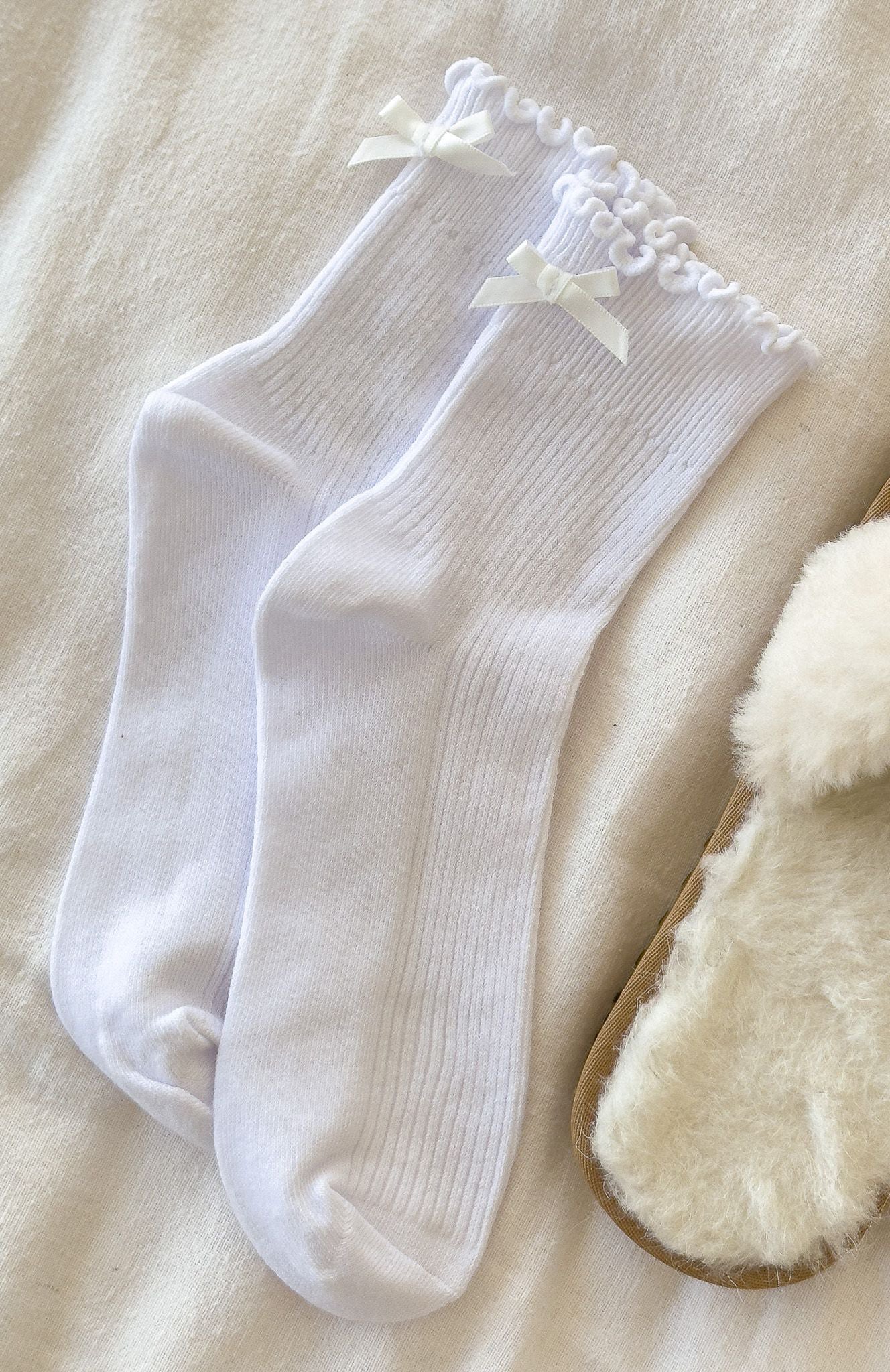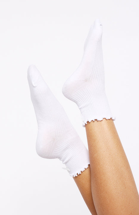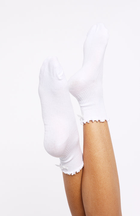 Too cute to resist! The Which One Socks White shows off a playful ruffle-hem with a dainty attached bow, while a supportive arch band and ribbed fabrication ensure a secure, comfortable fit. Slip them on to add a sweet, feminine touch to any outfit.